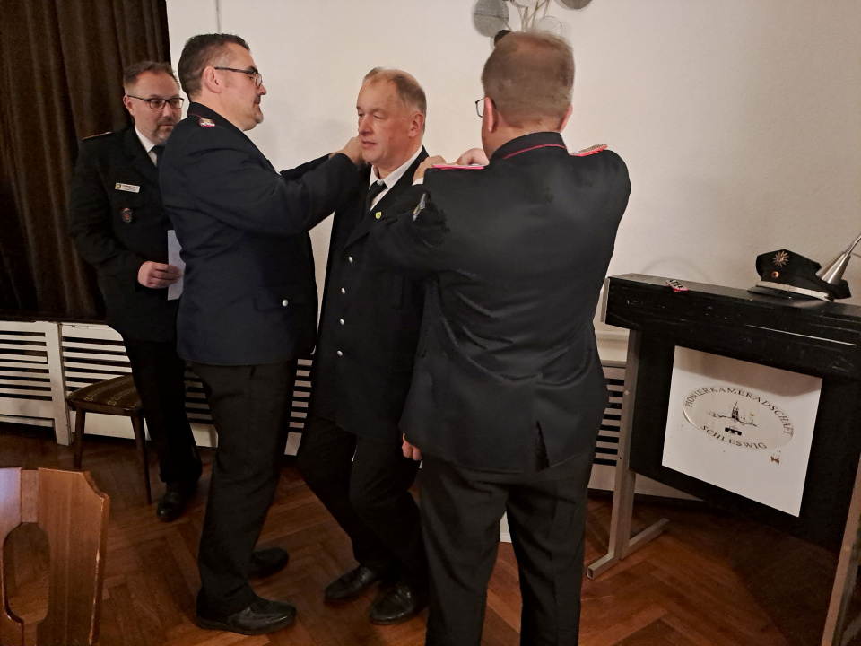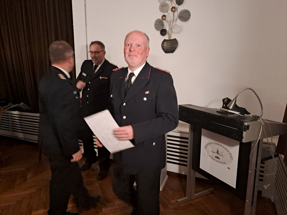 Ein weiterer Tagesordnungspunkt war die Beförderung von Michael Grindt (FFW-Hollingstedt) zum Hauptlöschmeister** und von Marc Thomsen (FFW-Hüsby) zum Oberbrandmeister durch Christoph Pautz als Vertreter des Kreisfeuerwehrvorstandes.